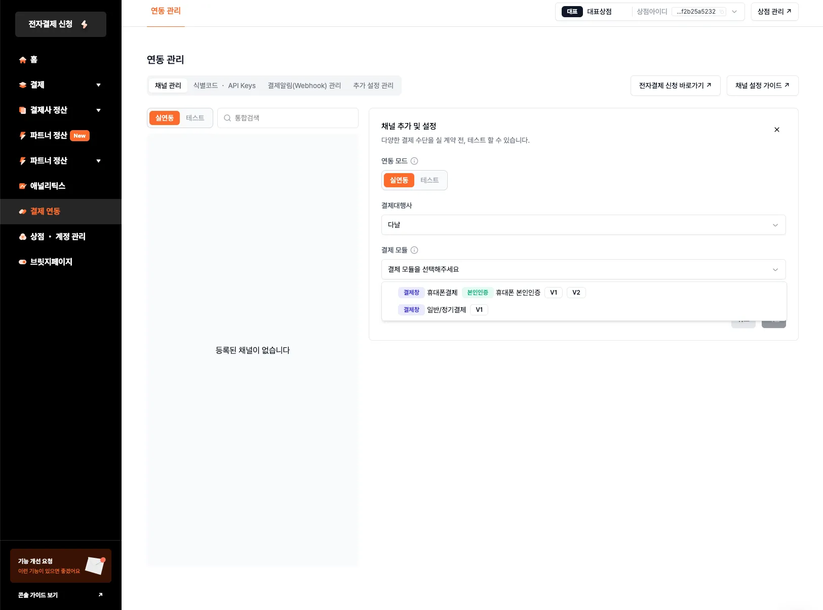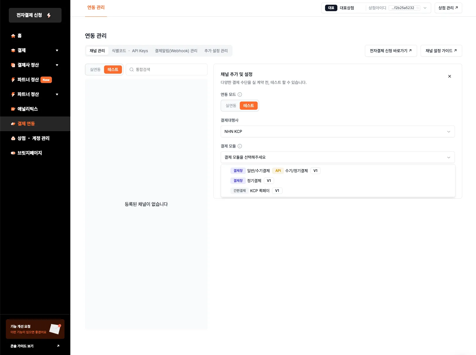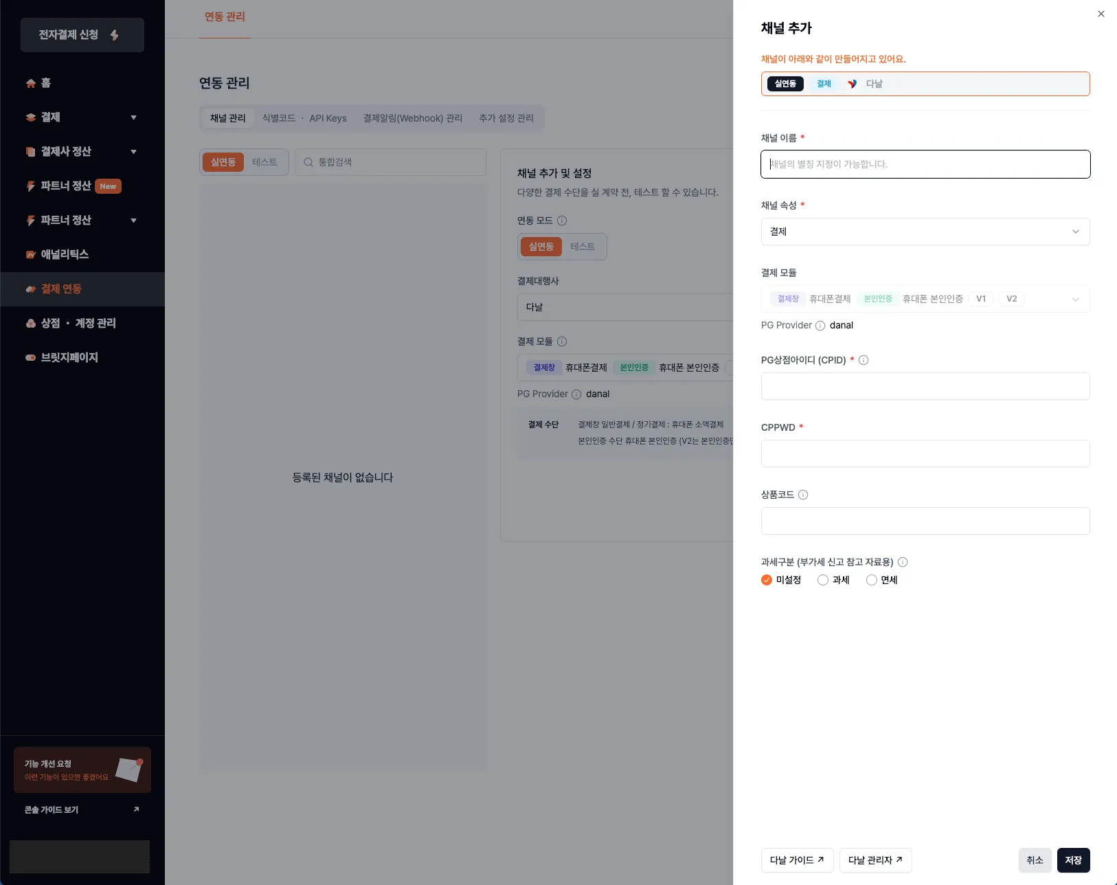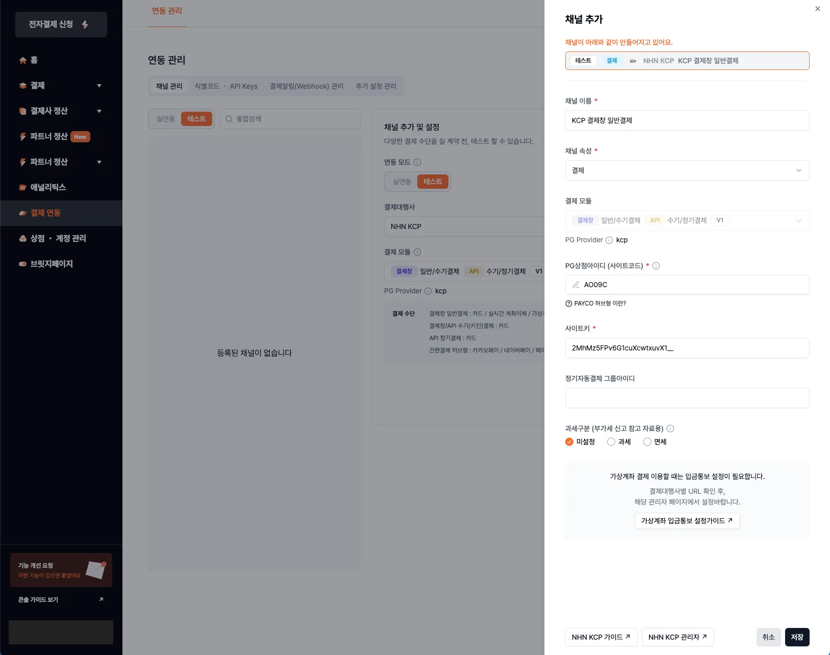 채널 추가 시 입력해야 하는 값은 결제대행사별로 다르므로 결제대행사 선택하여 연동하기 를 참고하여 확인 후 입력 및 저장해야합니다.