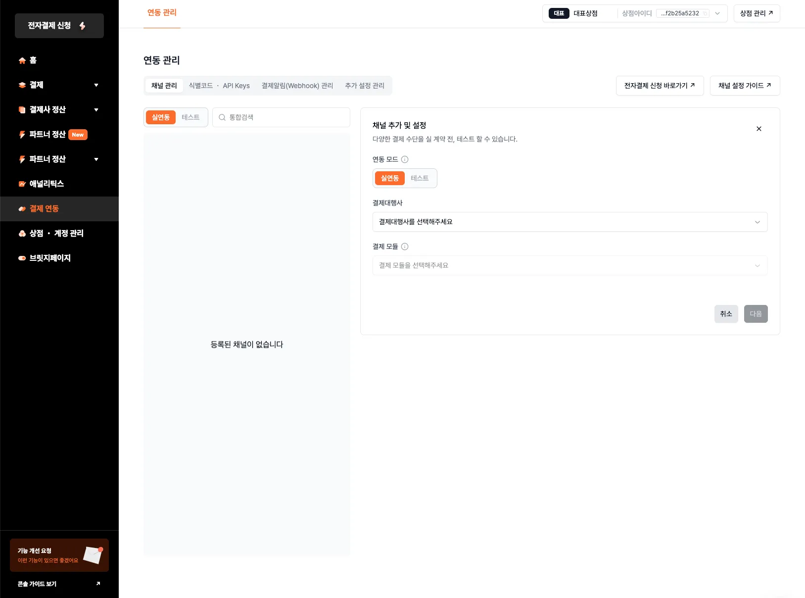 채널 등록 시 결제대행사별 저장하는 파라미터가 다릅니다. 파라미터 정보 확인은 하단의 [결제대행사 선택하여 연동하기]를 확인해주세요.